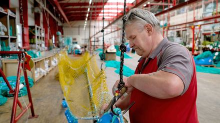 Altes Handwerk: Die Seilmacher am Rostocker Hafen fertigen Fischernetze und Stahlseile an. "Wir sind die Architekten fürs Leinen los", umschreibt Stefan Lehmann seine Arbeit und die seines Seilerteams. Stefan ist Chef von acht Mitarbeitenden in der 80-Meter-Halle auf dem Rostocker Hafengelände. Auf seinem Bildschirm hat der Diplomingenieur die nächste Zeichnung fertig. Komplizierte Linien und Zahlen sind darauf zu sehen. Ein Schleppnetz soll daraus werden, aber nicht irgendeins. Genau 35 Meter lang, 1,20 Meter hoch - nach DIN- Maß. Ein Auftrag für Maik Sorge. Der 62-Jährige war zu DDR-Zeiten Hochseefischer, schulte danach um und ist jetzt froh, in der Seilerei zu arbeiten. "Ich habe so noch Bezug zu den Fischern und fühle mich den Plattfischen durch den Job noch irgendwie verbunden." Plattfisch: genau das Thema. Denn das Schleppnetz darf nur Flundern und Schollen fangen, Dorsch und Hering müssen durch die Reusen fliehen können. "Dafür sorgt ein komplizierter Schließmechanismus, nicht ohne", meint Maik. Nur mit einem kleinen Schiffchen ausgestattet zieht Maik eine Öse nach der anderen durch das Netz, unterstützt vom Chef. "Alles genau abgezählt, wie der Auftraggeber es will und natürlich soll alles gestern fertig sein", lacht Chef Stefan Lehmann. Wird es rechtzeitig fertig werden? "Die Nordreportage" ist dabei und testet das Netz beim Fischer.