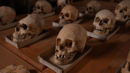 Auf einem römischen Friedhof in Ungarn finden Archäologen 1961 mehrere Skelette mit seltsam deformierten, länglichen Schädeln. Alle stammen aus der Zeit des Zusammenbruchs des Römischen Reiches. Die ersten dieser hier begrabenen Menschen mit kegelförmigen Schädeln kommen ursprünglich aus dem Osten - dem Land der Barbaren. Vermutlich gehören sie zum Stamm der Hunnen, jenen angeblich wilden Horden, die das römische Imperium gewaltsam zu Fall brachten. Doch was genau hat es mit den Kegelköpfen auf sich? Eine derartige Deformierung des Schädels muss im Säuglingsalter beginnen - bevor die Schädelknochen miteinander verbunden sind. Auf dem römischen Friedhof sind aber nicht nur Fremde mit Kegelköpfen begraben. Auch Einheimische befinden sich darunter. Das deutet darauf hin, dass römische Familien die Schädeldeformation der Hunnen an den eigenen Kindern durchführten und damit ihren neuen Herrschern die Treue bekundeten. Durch diese bewusste Verformung sahen allmählich immer mehr römische Nachfahren aus wie die Hunnen. Experten glauben, dass sich die Einheimischen so auf die Seite der angeblichen Barbaren stellten, als das Römische Reich zusammenbrach. Was hat es mit der sagenhaften versunkenen Stadt Kanopus auf sich - ist sie nur eine Legende, oder gab es sie einst wirklich? Was trug sich wirklich beim Kampf um Burnswark Hill zu, den die Römer mit vermeintlichen Geheimwaffen für sich entschieden? Und was ist der Grund für die unnatürlich deformierten Totenköpfe, die Archäologen auf einem alten römischen Friedhof in Ungarn entdecken? In der siebten Staffel der Reihe "Aufgedeckt - Rätsel der Geschichte" gehen Forscherteams diesen und anderen Rätseln der Weltgeschichte auf den Grund.