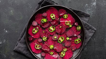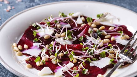 Dekoprofi Christin, 43 Jahre, serviert heute ein Drei-Gänge-Menü. Motto: Eine Reise in die Welt meiner Großeltern und meiner Kindheit Vorspeise: Gebackenes Rote-Bete-Carpaccio mit Meerrettich-Joghurt, Dill-Öl und gerösteten Walnüssen Hauptspeise: Königsberger Klopse nach Art meiner Oma und Mama Nachspeise: Schokotarte und Kirscheis mit Schokostückchen