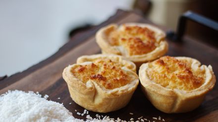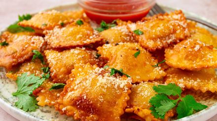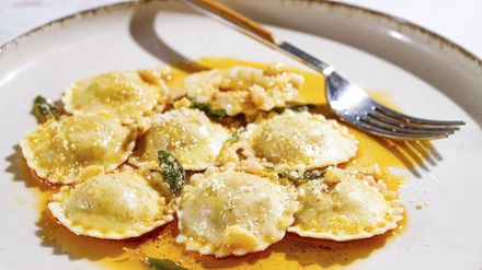 Greta, 22 Jahre, aus dem Saarland serviert heute ein Drei-Gänge-Menü. Vorspeise: Auberginen-Ziegenkäse-Törtchen mit karamellisierten Zwiebeln, begleitet von einem frischen Salat Hauptspeise: Hausgemachte Ravioli mit Kürbis-Maronen-Füllung, geschwenkt in Pilz-Salbei-Butter Nachspeise: Kokostörtchen mit Mango-Maracuja-Eis