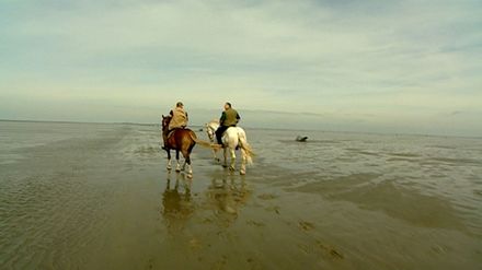 Pferdeheiler Tamme Hanken, veranstaltet in Filsum eine Fohlenschau. Wer hat den schönsten Nachwuchs? Mit seinem Pferd "Jumper" macht er einen Ausritt durchs Watt.