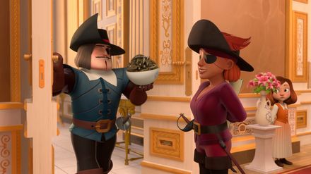 Charlotte in geheimer Mission: Als Lily Rouge sieht, wie Charlotte eine Frau vor einem Räuber beschützt, heuert sie sie an. Die Piratin hat es auf den Inhalt einer Truhe abgesehen, die Rochefort in den Louvre schafft. Charlotte bittet de Treville um Erlaubnis, zum Schein in Lily Rouges Mannschaft einzutreten, um sie dingfest zu machen. Er stimmt dem kühnen Vorhaben zu und Charlotte begibt sich auf geheime Mission. Zusammen mit Lily Rouge geht sie im Louvre auf Beutezug. Der Schatz der Drehleier: Die neue Drehleier des Königs stammt von einem legendären Instrumentenbauer, macht aber grauenhafte Musik. Angeblich soll sie einen Schatz zutage fördern, wenn man perfekt auf ihr spielt. Richelieu will den Schatz aus der Drehleier haben und beauftragt Milady damit, sie ihm zu besorgen. Ihre Handlanger tauschen die Stradovari gegen eine einfache Drehleier aus. Doch Lady Lala bemerkt den Betrug. Die Musketiere sollen die Stradovari-Leier zurückbringen.