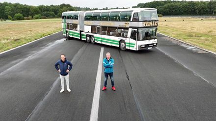Matthias Malmedie und Niki Schelle liefern sich ein packendes "Busfahrer-Duell" im legendären Neoplan Jumbocruiser aus dem Jahr 1976. Dieses beeindruckende Fahrzeug ist 18 Meter lang, bietet bis zu 144 Passagieren Platz und war einst der größte Reisebus der Welt. Während sie knifflige Aufgaben meistern, stellt sich die Frage, wie die beiden mit diesem Riesenfahrzeug umgehen und welche Rolle eine American-Football-Mannschaft dabei spielt.