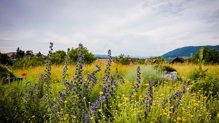 Die beiden Kunstschaffenden aus Kaltenbach haben auf einem 1,5 Hektaren grossen Grundstück in den vergangenen 23 Jahren eine Gartenanlage geschaffen, die sich weder durch Zaun noch durch Mauer von der Landschaft abgrenzt, sondern sich mit ihr verbindet. Dieser Garten ohne Grenzen setzt sich aus Staudenmischpflanzungen, Schattenrabatten, Kiesgarten, Wildblumenwiesen und Gemüsebeeten zusammen. Gegliedert wird die Anlage am Hang durch Trockenmauern, Rasenflächen, Rebenreihen und Kletterrosen. Und obwohl die Gestalterin meint, er sei jetzt gross genug, kommt trotzdem immer mal wieder eine neue Rabatte hinzu.