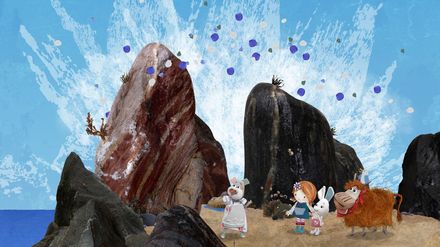 Die wilden Felsen: Flöckchen will mit Lily ein Picknick bei den wilden Felsen machen, wo es schön und einsam ist. Doch plötzlich hören sie ein gewaltiges Getöse und es spritzt hinter den Felsen. Sie denken, dort sei ein Monster. Nonna glaubt ihnen nicht und will sie beruhigen, doch auch sie und Barne kriegen es mit der Angst zu tun, als sie den Lärm hören. Zum Glück kann Salty das Ganze aufklären. Ein Sturm zieht auf: Lily findet ein Barometer. Auf Strandschatz Eiland zeigt es plötzlich auf "Sturm" und Salty sieht einen Notfall. Alle verbarrikadieren sich in Nonnas Cafe, bis die Gefahr vorüber ist. Sie verbringen die Zeit mit Kuchen essen und singen. Als Puffin aus Versehen die Tür öffnet, sind alle Bewohner mehr als erstaunt.
