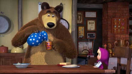 Die Magie der Kunst: Liebe liegt in der Luft. Mascha führt ein romantisches Puppentheater auf, die Frösche sind in der Paarungszeit, und auch der Bär möchte seine Angebetete mit einer Gondelfahrt beeindrucken. Leider macht ihm Mascha einen Strich durch die Rechnung. Zuerst sollen die verzauberten Königskinder zurück zu ihrer Gestalt finden. Dazu muss der Bär jede Menge Frösche küssen. Schon wieder Hafergrütze?: Jeder hat seine Lieblingsspeise. Doch Hafergrütze zum Frühstück? Das geht überhaupt nicht. Mascha lässt sich vom Bären nicht überzeugen und ist auch mit Zwiebelsuppe nicht einverstanden. Sie macht sich auf den Weg und probiert, was ihre Freunde im Wald und auf dem Hof alles so essen. Kann es wirklich sein, dass es doch nichts besseres als Hafergrütze zum Frühstück gibt? Und dass Mascha noch nie etwas Leckereres gegessen hat?