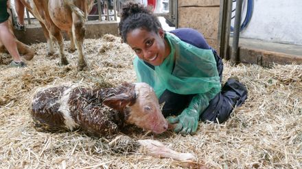 Meli ist Großtierärztin. Sie behandelt vor allem Wiederkäuer: Rinder, Ziegen, Schafe, Alpakas. Pia durfte sie einen Tag lang begleiten. Der erste Einsatz galt einer schwierigen Kalbgeburt, bei der die Kuh Leni unterstützt wurde. Auf dem Gnadenhof Chiemgau wartete der Ziegenbock Moritz, dessen Gelenkschmerzen gelindert werden mussten. Schließlich bekamen zwei Alpakas eine Kur gegen Parasiten.