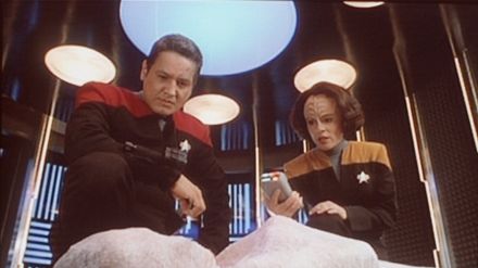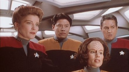 Gemeinsam mit den verfeindeten Maquis ist die Crew der Voyager von einem fremden Wesen 70.000 Lichtjahre von der Erde entfernt in eine unbekannte Milchstraße des Delta Quadranten geschleudert worden. Eine Kalkulation ergibt, dass sie ganze 70 Jahre brauchen werden, um jemals wieder in heimatliche Gefilde zu gelangen. Dafür müssen über weite Strecken unbekannte Universen durchqueren, schwere Kämpfe, Nöte und diverse Abenteuer bestehen. Die kontrahierenden Lager beschließen, sich unter der Führung von Captain Kathryn Janeway (Kate Mulgrew) für die weite Heimreise zu verbünden. - "Raumschiff Voyager" ist die vierte im Star-Trek-Universum angesiedelte Fernsehserie.