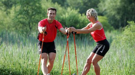 Überall auf Straßen, Wiesen und Feldern sieht man sie im schnellen Schritt: die Nordic Walker. Jetzt zeigt TELE-GYM, wie man diese Sportart abwechslungsreich gestalten und sich damit optimal auf den Wintersport vorbereiten kann. Nordic Walking wurde ursprünglich als Sommertraining für Skilangläufer entwickelt. Es ist das perfekte Ganzkörpertraining für jedermann, da 90% aller Muskeln im Einsatz sind. Das Übungsprogramm ist in Zusammenarbeit mit dem Deutschen Skiverband aus dem Nordic-Walking-Sport heraus entwickelt worden. Gekräftigt werden Beine, Po, Bauch, Arme und Rücken, spezielle Übungen schulen die Balance- und Koordinationsfähigkeit. Die Übungen sind so aufgebaut, dass sie sowohl als eigenständiges Training durchgeführt, aber auch bestens zur Abwechslung ins Nordic-Walking-Training eingebaut werden können. Der Nordic Walker kann auf diese Weise die positive Wirkung auf den Organismus noch wesentlich erhöhen. Für Nicht-Nordic-Walker ist das Training ein perfektes Fitnessprogramm, das auch zur Vorbereitung auf den Wintersport dient. Alle Übungen werden mit und ohne Stöcke demonstriert. Effektive Mitmach-Gymnastik die Spaß macht, Profi-Tipps zum richtigen Walken und die Präsentation von tollen DSV E.ON-Bayern-Nordic-Walking-Zentren in Bayern - das alles gibt es in jeder Folge "Nordic Walking mit Peter Schlickenrieder"!